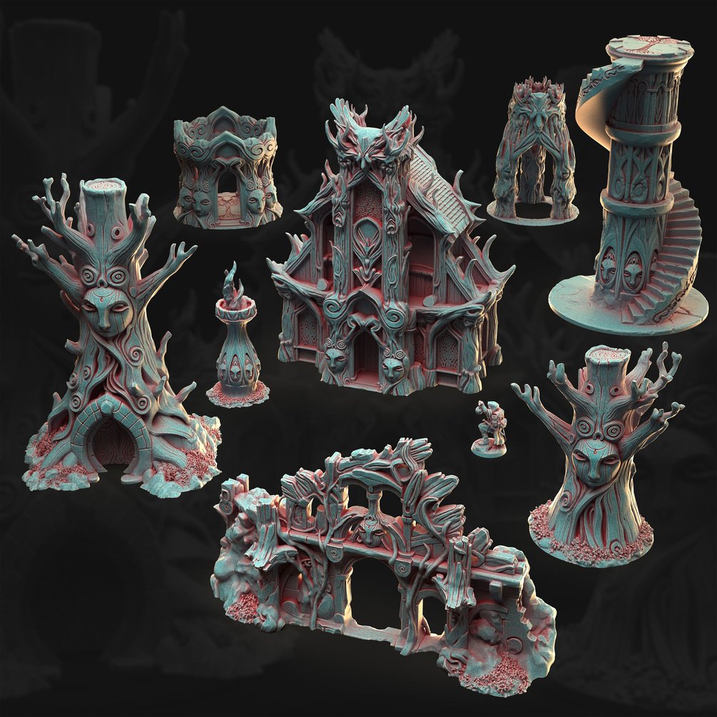 This set includes towering structures, mythical guardians, ritual sites, and scattered ruins - everything you need to bring your RPG sessions, wargame battlefields, or dioramas to life with a unique forest-mystic atmosphere.